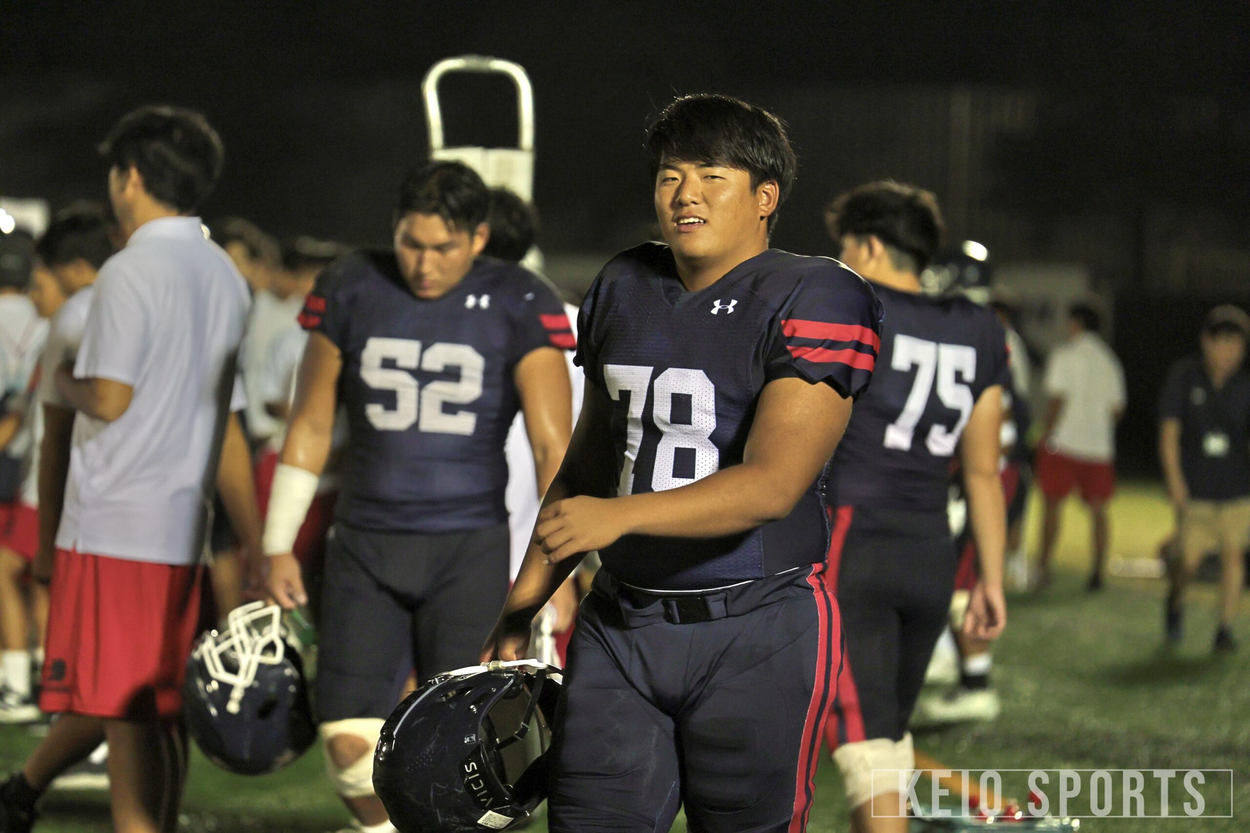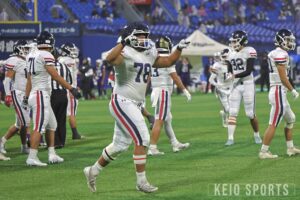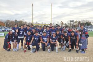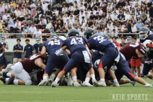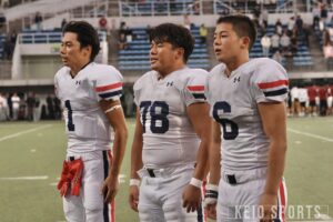 試合も、QB・山岡葵竜(政4・佼成学園)を走らせるプレーで徐々に反撃を開始。しかし、大一番で反則からTDを奪われピンチに追い込まれる。そして作田の印象に残っているのが、ゴール前4th&goで山岡が自らフレッシュを勝ち取った場面。「ヤード数が結構残っている中で4thダウン、しかも残りは1分を切っていた。諦めかけていた勝利を、もう一度信じさせてくれた」と振り返る。さらに、終盤で勝利を大きく手繰り寄せたロングパス。「葵竜のパスをとったのが猪ノ原(=浩臣/経4・慶應)なのがらしいな。なんでお前がそこにいるのって感じだけど、普段からずっと一緒にいる相棒にパスを通してタイムアウトをとって、本当に葵竜らしいプレーだった。あの瞬間にいろんな感情が溢れ出して、サイドラインでは最後のキックの時に全員がほぼ土下座みたいにひざまずいて祈ってたな」と試合中の様子を懐かしそうに話してくれた。最後は、K・北村朔也(商2・宇都宮短大附)がフィールドゴールを決め切り、ラスト1分から劇的勝利を飾った。また、試合後の横手の涙が忘れられないという作田。「感情をあまり表にする人じゃないから、主将として抱えてきてたもの、苦しさを初めてみられて、頑張ってくれてたんだなっていう感謝が強く出てきたかな。個人としては、出られなくて、出しきれなくて、嬉しい悲しいっていう感情が渦巻いている自分と、それを俯瞰している自分。苦しいラストシーズンだったけど、とりあえず勝てて良かった」と安堵の表情を見せた。