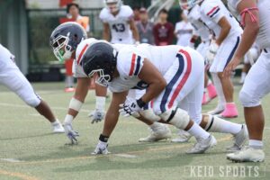 幼稚舎時代からユニコーンズの作田にとって、大学でアメフトを続けることに迷いはなかった。高校の引退後は大学のための準備期間として使い、肩を手術。満を持して慶大アメフト部に入部するはずが、活動休止により2ヶ月ほど入部が遅れた。そしてアメフト部はシーズン開幕を前に活動を再開するも、初戦の2週間前にくるぶしを捻挫。さらに1ヶ月遅れて戦線に復帰した。そして、今でも鮮明に覚えていると語るのが3連敗で迎えた10月4日の日大戦。作田は1年生ながらスタメンで出場すると、強豪・日大相手にQBへのナイスタックルや技術力で打ち勝つ活躍を見せた。さらに、4年間で唯一のQBサックが炸裂した試合でもあった。シーソーゲームの末に、残り1分で玉川雄基(令和7卒)のキックで勝ち越しに成功すると、最後はディフェンスが守り切って劇的勝利を上げた。作田にとって4年間で最も活躍できた、忘れられない試合だという。