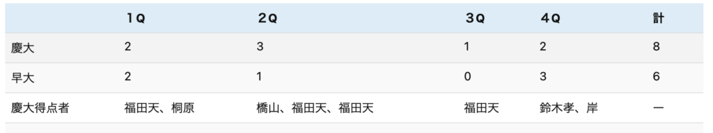前半から結構早稲田が点が取ってきて、そこに対してこっちのオフェンスもしっかり大量得点、8点取れたんですけど、相手も 6点でなかなか大差つけられなくて。もう少しできたかなというシンプルな感想です。