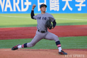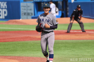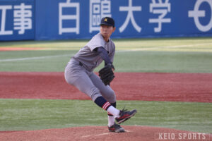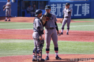 7回裏、鈴木佳は本間からこの日3つ目の三振を奪うも、2死から木津寿哉(心理3・國學院久我山)に中安打、その後盗塁も決められる。さらに代打・新垣熙博(スポ4・帝京)に四球を許し、2死一、二塁で小林隼という一打同点のピンチ。ここで慶大は鈴木佳から水野敬太(経3・札幌南)にスイッチする。水野は小林隼を二ゴロに打ち取り、火消しに成功する。