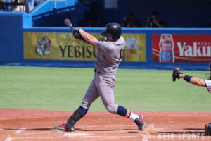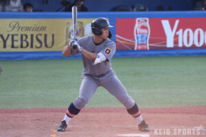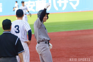 8回表、慶大打線は立大の2番手・林亮玖(スポ4・武蔵越生)を攻め立てる。先頭・今津が中安打で出塁すると、すかさず盗塁を決め無死二塁のチャンスに。ここで守備から途中出場の横地が右中間に適時三塁打を放ち、1点を追加。さらに一宮知樹(経2・八千代松陰)が立大3番手・菅野竜輝(コミュ3・県立高田)から中堅手の頭上を襲う適時二塁打を放つ。