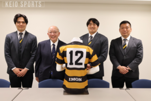 慶大蹴球部による表敬訪問も行われた。 左から蹴球部・坊碧人主務(環4・慶應)、 井門エンタープライズ・井門義博社長、蹴球部・恩田優一郎主将(政4・慶應)、青貫浩之監督