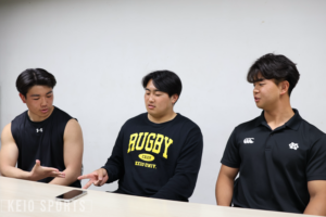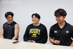 接戦の末、花園ラグビー場で「日本一」の夢が潰えてから約4か月。再び大学ラグビーの頂を目指し、新たなスローガン「ALL IN」を掲げた127代蹴球部の戦いが幕を開ける。今回ケイスポでは、今年度リーダーとして蹴球部を引っ張る11人に今シーズンの意気込みを伺った。初回となる今回は、主将・恩田優一郎(政4・慶應)、副将・笠原悠真(政4・慶應)、Jr.リーダー・石野創太郎(理4・川和)にインタビュー。ラストイヤーを迎えた3人は、それぞれどのような思いで楕円球に向き合うのか。