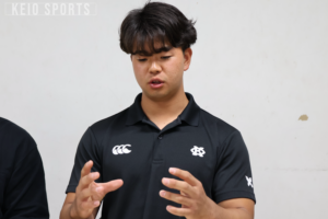 石野:メンタル、パッションの部分は対抗戦トップレベルだと思っています。あとはWTBなので、ステップやパスは得意な方ですね。ただ。悠真や怜大(松田怜大=環4・桐蔭学園/BKリーダー)、そして対抗戦トップクラスの選手と比べるとまだまだ足りない部分が多いと自覚しているので、努力で追いついて、慶應の戦力として活躍できるよう、更に成長していきたいと思います。