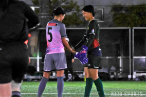 この時間帯はチャンスが続いたが、その後は相手のプレースピードに苦戦し、何度もゴールを脅かされる。23分。左サイドを突破され、中央の相手CFにペナルティースポット付近でボールを受けられる大ピンチ。しかし、右CB・木田遥(総1・十文字)が見事なカバーリングでブロック。シュートは打たせない。27分にはボックス内で枠内シュートを浴びるが、四宮が好セーブを見せる。