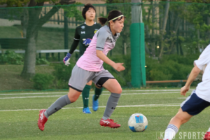 さらに17分。佐藤とのスイッチで内側に入った福島紗が左CB・宮嶋ひかり(環3・芝浦工業大学柏/ジェフユナイテッド市原・千葉レディースU18)からパスを受け、野村に縦パス。野村はダイレクトで野口に落とし、野口から右の森原へ。森原は左足でミドルシュートを放つが、相手DFのブロックに遭い、得点には至らない。