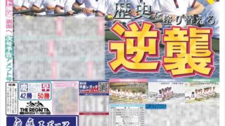 1面を飾るのは昨年の対抗エイトの写真です。2年連続で惜敗を喫した悔しさをバネに、新たな練習法を取り入れるなどチーム一丸で変革を進めてきた中で臨む早慶戦。選手たちの勝利への強い執念が感じられる面に仕上がっています。当日の大会プログラムや各クルーの意気込みも必見です!!
