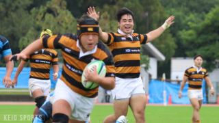 本試合では、前半に5トライを許してしまい、そこでの失点が勝敗に直結する形となったが、内容としてはほぼ互角であり、課題がはっきり見えた試合だったと言えるだろう。前半の慶大の失点パターンとして、スクラムでのコラプシング、ノットリリースザボールから攻め込まれてトライを許していた。それだけ同大のFW陣が強く、スクラムでは3番を崩され、ブレイクダウンの攻防では圧力をかけられる場面が多かった。一方後半は、山田の再三のキック、ランでボールを動かし、自ら走って攻めていくことができた。ボールが広い範囲で動く中、FW陣、BK陣ともに運動量を落とすことなく戦い続けたことが、後半の5トライにつながったと言えるだろう。また、最後の渥美のトライは、ペナルティー獲得後も集中力を切らさなかったということで今後につながっていき、早慶戦などの競った終盤の場面で力を発揮するためのキーになるだろう。