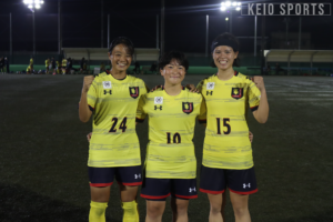 試合は前節と同様に、慶大がボールを保持する展開。しかし、立大DFの粘り強い守りをなかなか攻略しきれず、終盤までスコアレスで進行する。両軍決め手に欠き、引き分けも見えていたが、待望の瞬間は83分、10番・野口初奈(環3・十文字)がFKを蹴り入れると、ボールはゴールマウスに吸い込まれ、先制点を挙げる。ついに立大ゴールをこじ開け、完全にペースを掴んだ慶大は89分、ショートコーナーからチャンスを作ると、こぼれ球を宮嶋ひかり(環2・芝浦工業大学柏/ジェフユナイテッド市原・千葉レディースU18)が押し込み、2点目。貴重な追加点を奪う。さらに90+4分、途中出場の田中紗莉(総2・市ヶ尾/日体大SMG横浜U18)がスーパーミドルシュートを決め、3点目。終盤の怒涛の得点ラッシュで、終わってみれば3−0で勝利した。