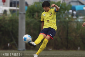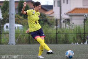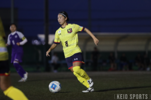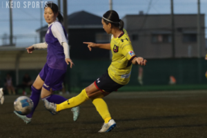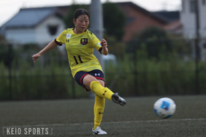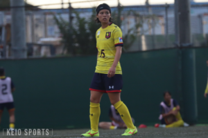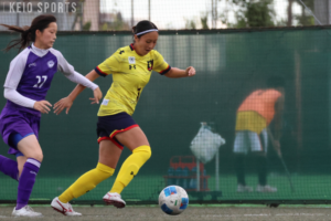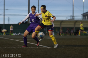 給水タイム明けの29分頃、縦パスを受けた森原が大外の岩田にはたくと見せかけ、鋭い切り返しからボールを運ぶと、野村が斜めのランニングからパスを受けてシュートを放つ。しかし、これはキーパーの正面を突き、ネットを揺らすことは出来ない。前半最大のピンチは32分頃、CKのクリアボールを拾われ、ロングシュートを放たれるが、キーパー・中村美桜(理4・慶應湘南藤沢)が落ち着いてキャッチ。ゴールは割らせない。