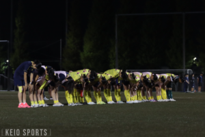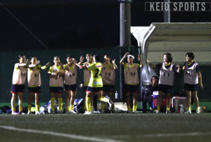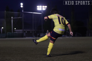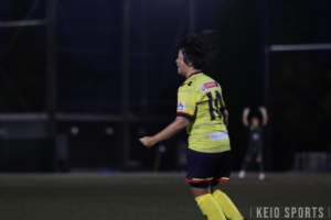 給水タイム明けの29分頃、縦パスを受けた森原が大外の岩田にはたくと見せかけ、鋭い切り返しからボールを運ぶと、野村が斜めのランニングからパスを受けてシュートを放つ。しかし、これはキーパーの正面を突き、ネットを揺らすことは出来ない。前半最大のピンチは32分頃、CKのクリアボールを拾われ、ロングシュートを放たれるが、キーパー・中村美桜(理4・慶應湘南藤沢)が落ち着いてキャッチ。ゴールは割らせない。