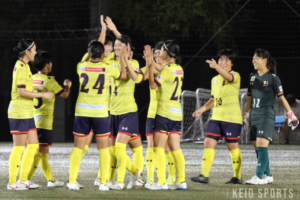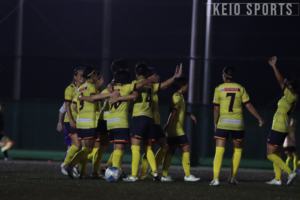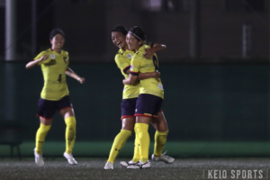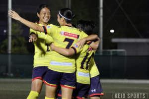 試合は前節と同様に、慶大がボールを保持する展開。しかし、立大DFの粘り強い守りをなかなか攻略しきれず、終盤までスコアレスで進行する。両軍決め手に欠き、引き分けも見えていたが、待望の瞬間は83分、10番・野口初奈(環3・十文字)がFKを蹴り入れると、ボールはゴールマウスに吸い込まれ、先制点を挙げる。ついに立大ゴールをこじ開け、完全にペースを掴んだ慶大は89分、ショートコーナーからチャンスを作ると、こぼれ球を宮嶋ひかり(環2・芝浦工業大学柏/ジェフユナイテッド市原・千葉レディースU18)が押し込み、2点目。貴重な追加点を奪う。さらに90+4分、途中出場の田中紗莉(総2・市ヶ尾/日体大SMG横浜U18)がスーパーミドルシュートを決め、3点目。終盤の怒涛の得点ラッシュで、終わってみれば3−0で勝利した。