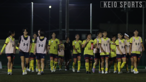 関東大学女子サッカーリーグ戦2部を戦う慶大ソッカー部女子。前期第3節に今季初勝利を挙げると、そこから10連勝でリーグ戦中断期間に突入した。首位で迎えたリーグ再開初戦の国際武道大学戦では、序盤からボールを保持しながらも、得点することは出来ずに前半終了。ゴールが遠く、嫌な流れかと思われたが、後半開始早々、野口が立て続けにゴラッソを決めて2点のリードを取ると、2−1で迎えた終了間際、山田葵(総1・聖和学園)がダメ押しゴールを決め、3−1で勝利した。