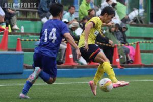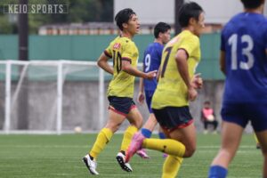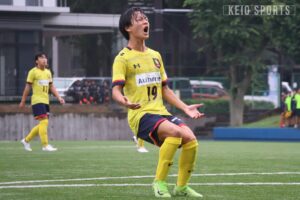 89分、右サイドバックの藤平に代えて霜田晟那(理1・都立八王子東/FC町田ゼルビアユース)を投入。すると90+3分、齋藤真が角田とのワンツーで相手守備網を突破し、ペナルティエリア左のポケットへと侵入。そこで相手DFに倒され、慶大がPKを獲得する。重圧のかかる場面だったが、キッカーの角田が冷静にゴール左上へと蹴り込み、ついにスコアを3−3の同点に戻す。