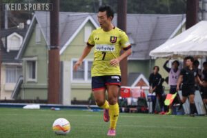 1部残留に向け、この試合を落とすわけにはいかない慶大は31分、右サイドをドリブルで駆け上がった右WG三浦大其(経2・慶應)が相手DFに倒されフリーキックを獲得すると、ボランチ角田惠風(商4・慶應/横浜F・マリノスユース)の相手の隙を突いた素早いリスタートで再び三浦大にボールが渡る。鋭いカットインからニアに強烈なシュートを放つが、これは相手キーパーのビッグセーブに阻まれ、追撃点を挙げることはできない。しかし、このシュートを起点に勢いを取り戻した慶大は、37分に自陣からCB大下崚太(商4・慶應/東京ヴェルディユース)、左SB永澤昂大(政4・國學院久我山)、角田、齋藤真、そしてもう一度永澤とテンポよくボールを繋いでビルドアップを完結させ、左サイドから敵陣に侵入しチャンスを作るなど、徐々に相手ゴールに迫る機会を増やしていく。