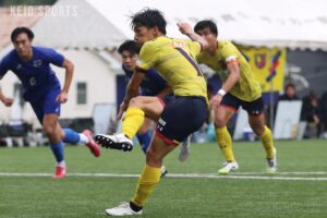 69分、慶大がコーナーキックを獲得。キッカーの角田がショートコーナーを選択し、齋藤真が受けてバイタルエリアの田中へパスを送る。田中は迷わず右足を振り抜き、放たれたボールは美しい弧を描きながらゴール右隅へと吸い込まれた。待望の1点を返し、反撃の狼煙を上げる。