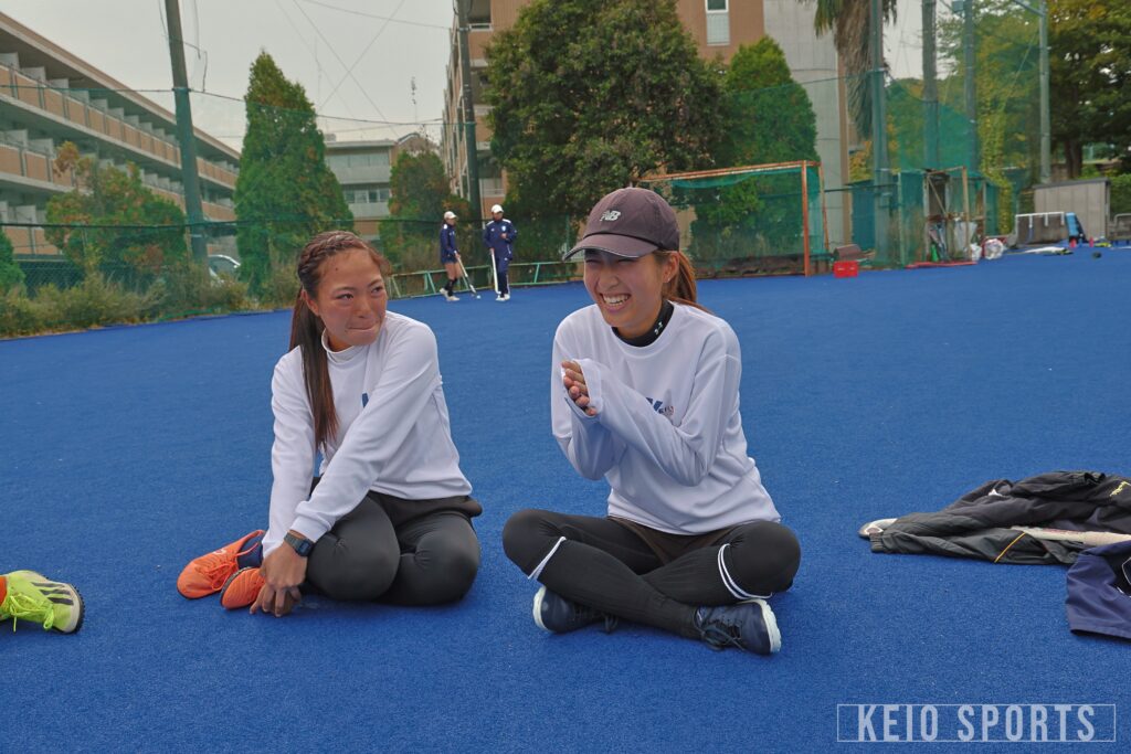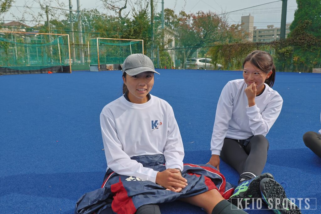 江原→尾関:尾関恵真です。同じ帰国組で、唯一SFCの時から一緒だったんですけど、仲良くなったのは大学に入ってからで。部に入った時は本当に不安だったんだけど、恵真とかと仲良くなれたおかげで、ホッケーを頑張ろうと思えました。ホッケー面ではキャパがすごいなと思っています。恵真は視野が広いし人に発信もできて、それって自分に自信と、それを持てるだけの努力があると思うので。本当にチームを支えてくれている選手です。性格では、全体には見えていない甘えん坊だったり、すぐ落ち込んじゃう私とかにも声をかけてくれる温かさもある子だと思っています。
